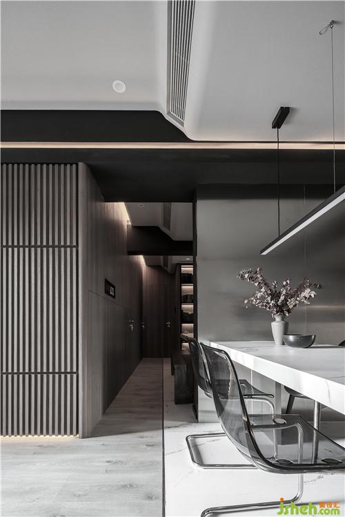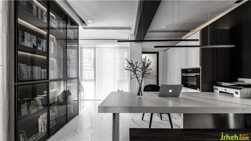 多功能室的書(shū)柜運(yùn)用玻璃推拉門(mén),百葉窗讓充足采光穿透到客餐廳。整個(gè)空間采用黑白+木色為色調(diào),營(yíng)造出最干凈溫和的視覺(jué)觀感。半開(kāi)放式的多功能室是對(duì)空間“關(guān)系”的思考,互通性與私密性共生。黑色的線條流動(dòng)其中,用線條構(gòu)建簡(jiǎn)潔的利落感。