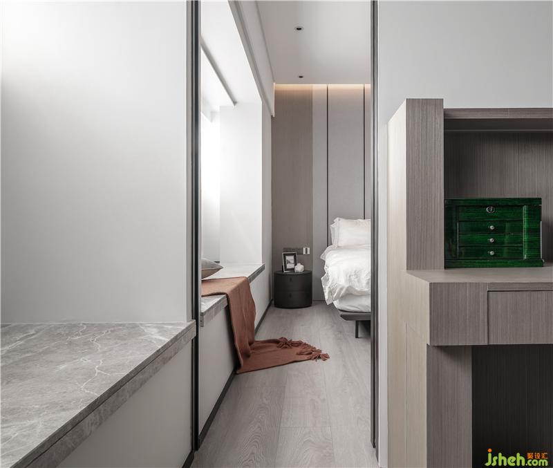 衣帽間在主臥內(nèi),利用書(shū)桌結(jié)構(gòu)設(shè)置了隱形門,形成環(huán)形動(dòng)線,隱形門關(guān)起來(lái)畫(huà)面是整體性的,打開(kāi)之后可以互相對(duì)話。