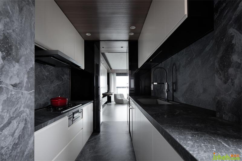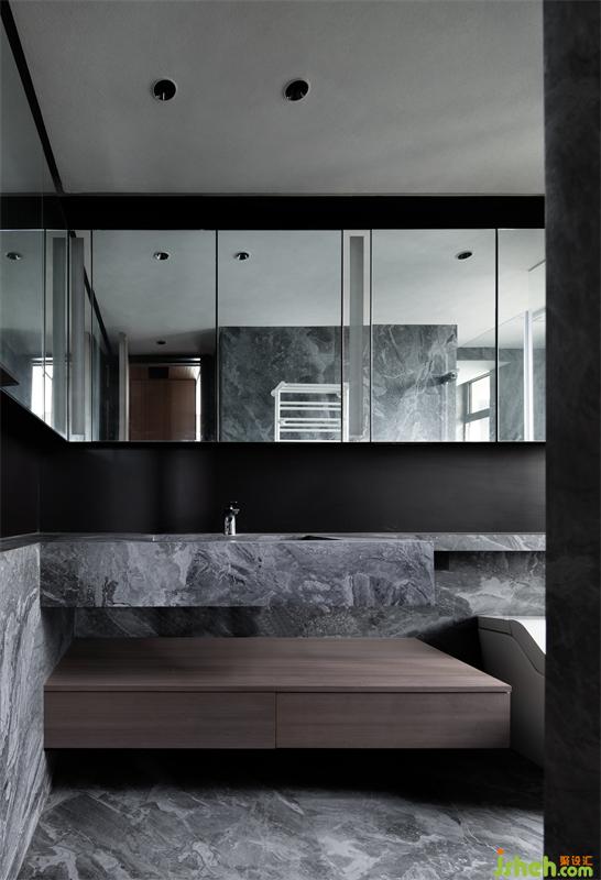 衛(wèi)生間大面積運(yùn)用大理石搭配黑鋼的設(shè)計(jì),在整理保持美感的同時(shí)降低維護(hù)陳列感,利用光影鏡面放大空間格局,視覺感開闊自由。