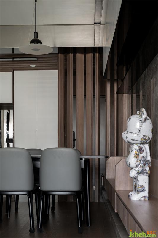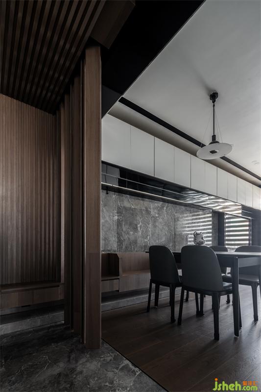 進(jìn)入玄關(guān),木格珊錯(cuò)落立在餐廳旁邊作為客廳的屏風(fēng)