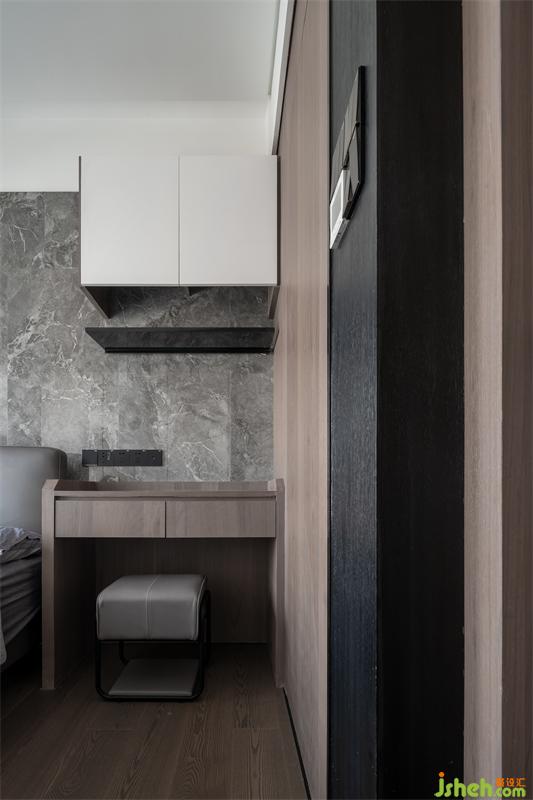 床頭皮質(zhì)軟包搭配大理石紋路的墻磚,是堅硬和柔然的碰撞