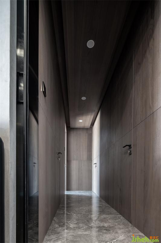 穿過木飾面搭配大理石紋路的地面的過道,就是主臥
