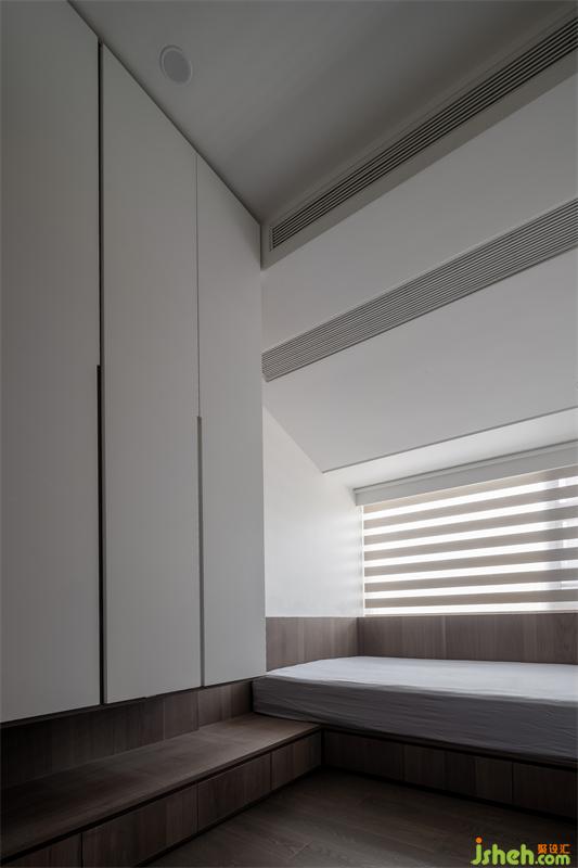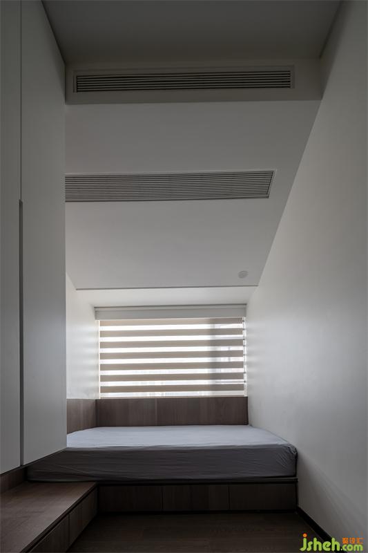 簡潔的白色天花斜面設(shè)計既隱藏了空調(diào)的存在感,又放大了空間,一舉兩得