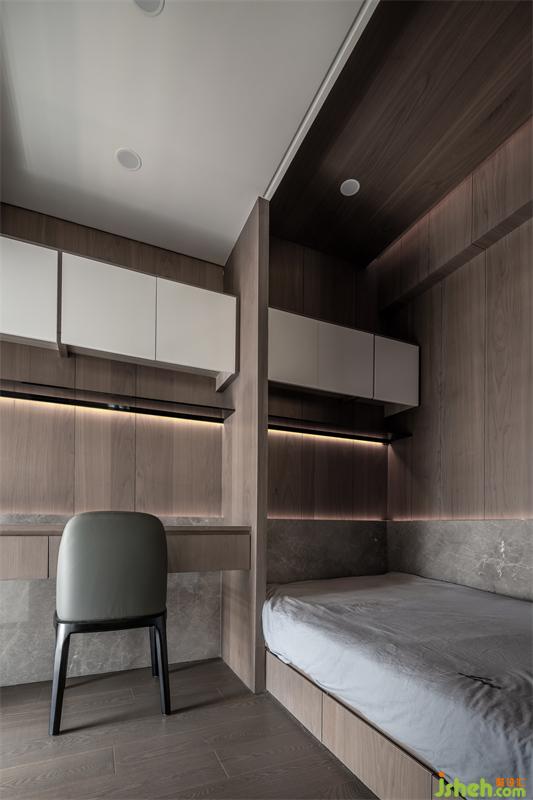 現(xiàn)場木作榻榻米,包圍同色系的墻裙,營造舒適的臥室空間