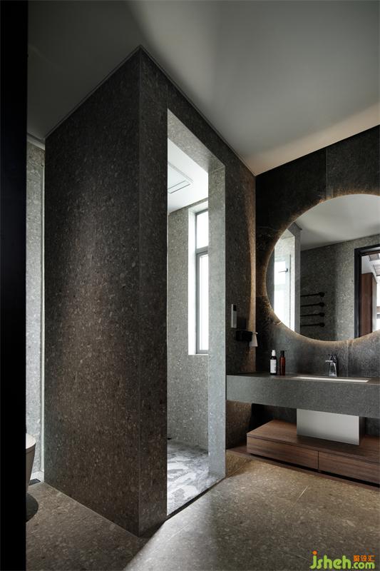 主衛(wèi)同樣使用反差的色調(diào),大面積地運(yùn)用鏡子以及不同的幾何造型,錯落有致地把空間的立體感呈現(xiàn)出來。