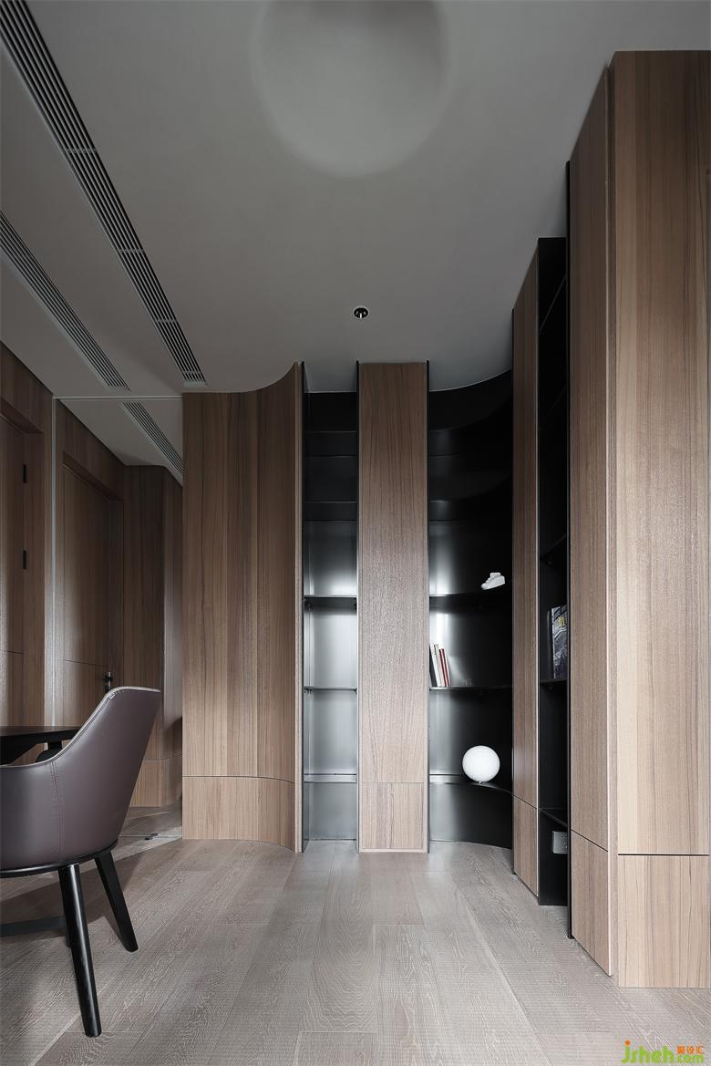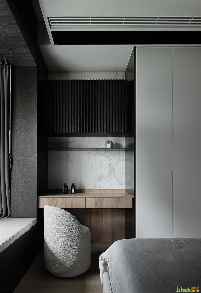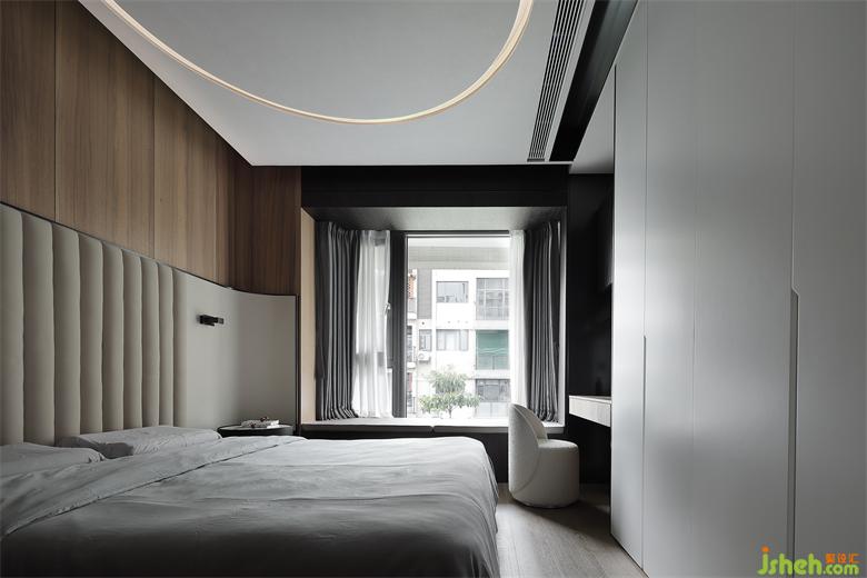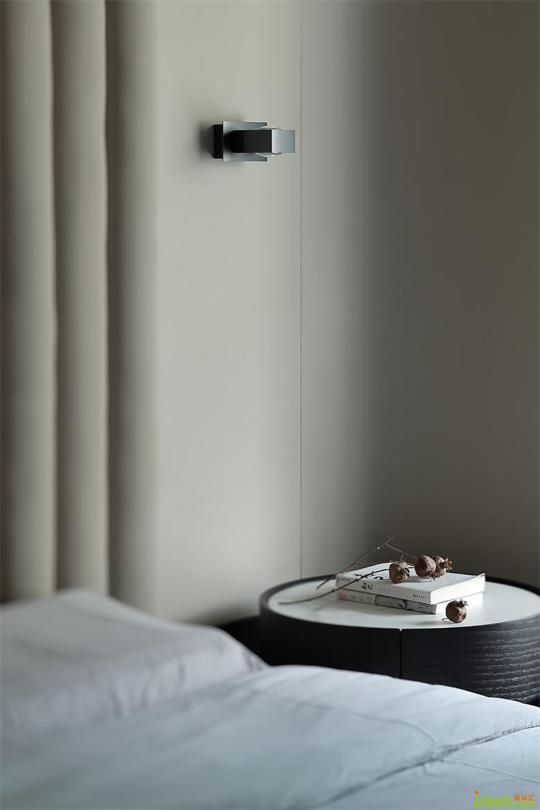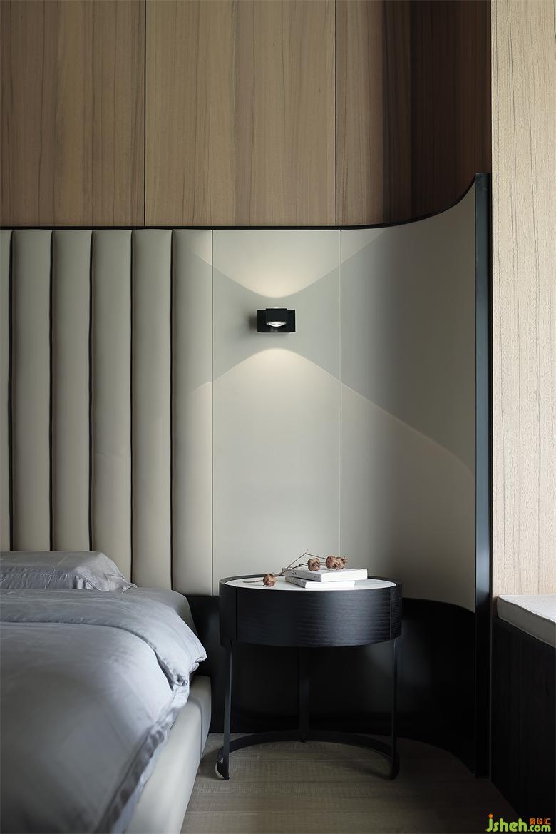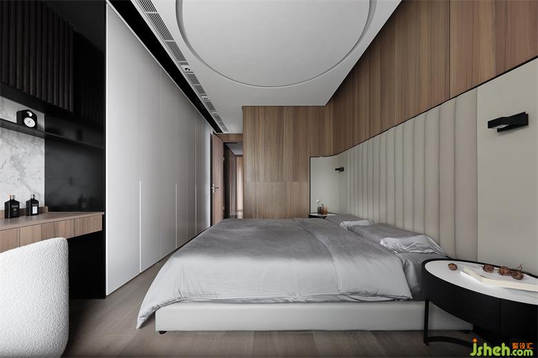 主人房的設(shè)計,在自然之境的主題下,天花的圓似蒼穹,點(diǎn)線面的勾勒組合將空間功能簡單的表達(dá),有溫度的質(zhì)感的軟裝單品,點(diǎn)到即止,時尚與質(zhì)感的交融,展示屋主的品味喜好,金屬、木飾面和房屋中大面積白色形成碰撞和交匯,給房間增添了自然的生命力的同時卻又各自成景。木子仁設(shè)計主臥與主衛(wèi)形成套房設(shè)計,隱藏門和木飾面墻體連成一體,功能各司其職卻又和諧共存,豎木紋的懸空柜子和過道設(shè)計手法一致,光深淺交織交織出和諧的畫面。