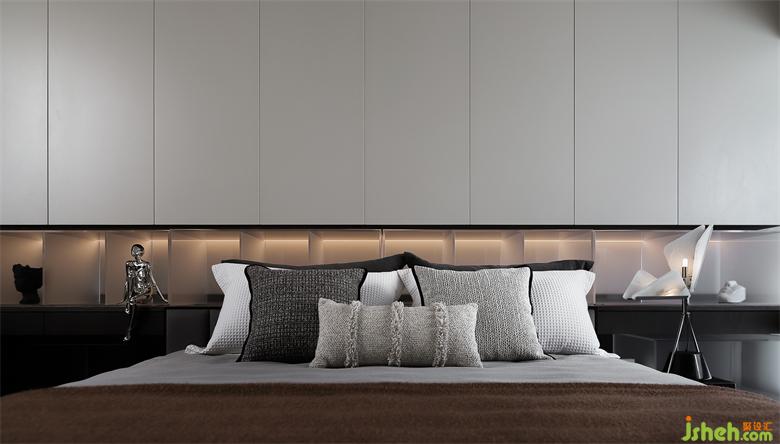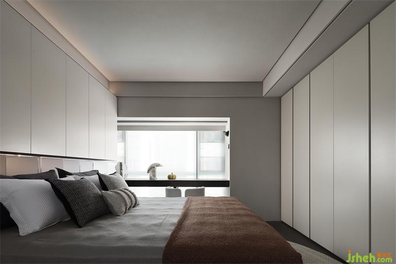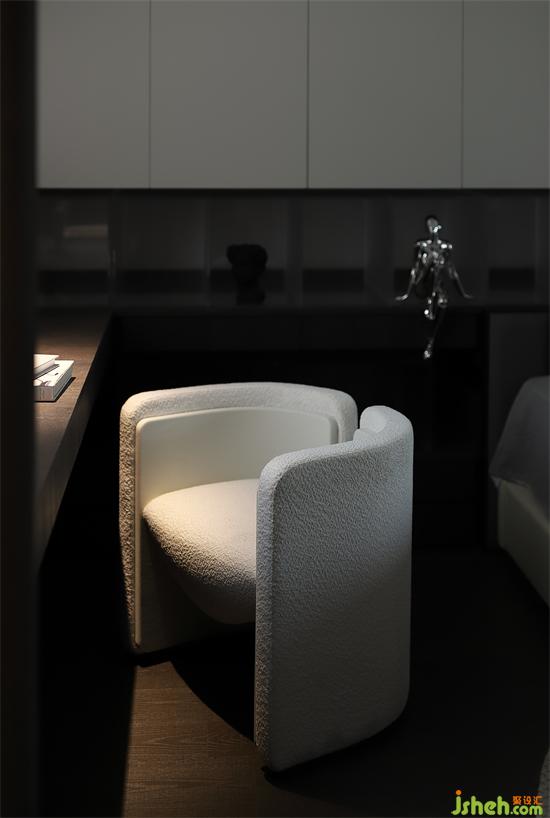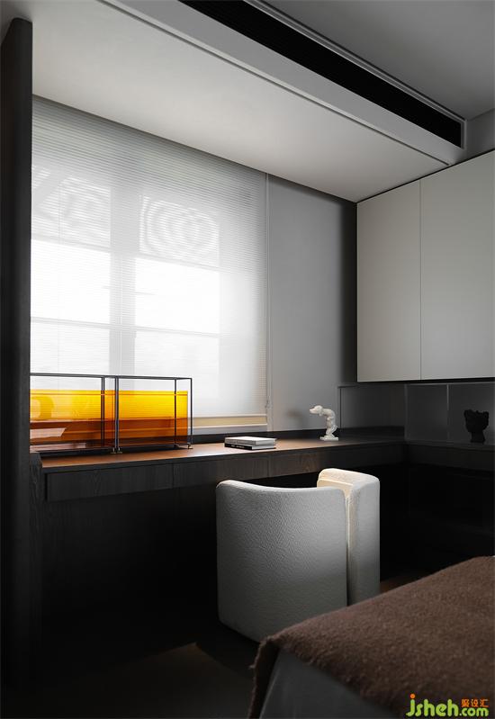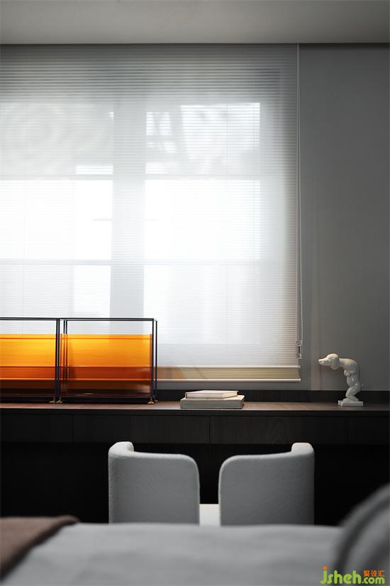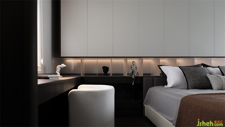 次臥的設(shè)計,家裝設(shè)計手法表現(xiàn)了簡潔和留白的意境,同時通過天花斜頂?shù)脑O(shè)計完美包攬了天花反梁對風(fēng)水的破壞,形成了舒適的美學(xué)體驗(yàn)和濃重的藝術(shù)氛圍,木飾面的護(hù)墻板與寫字臺連成一體,完成畫面完整并功能保持和諧共處,空間功能動線合理交織又各自獨(dú)立,自然的光與影對材質(zhì)肌理的表達(dá)呈現(xiàn)出淋漓盡致的觀賞感。