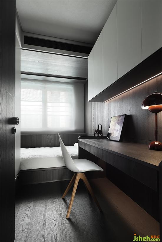 兒童房有限的空間卻也同樣功能一應(yīng)俱全。大大的寫字臺為兒童描繪的未來藍(lán)圖。家裝設(shè)計窗戶自然的光線也灑在木飾面的臺面上,簡單不失大氣的設(shè)計符合人體工程學(xué)。木飾面的榻榻米與護墻板以及桌面材質(zhì)一致,形成整體感,轉(zhuǎn)角磨圓的設(shè)計,木飾面安定的質(zhì)感,給兒童房加了安全的濾鏡。