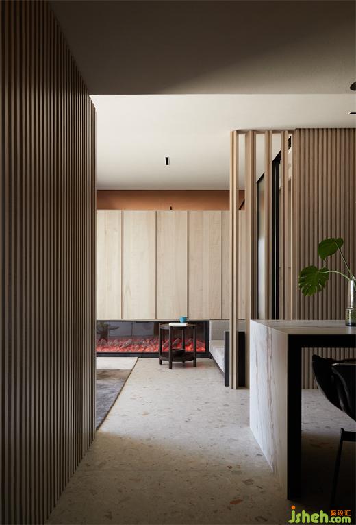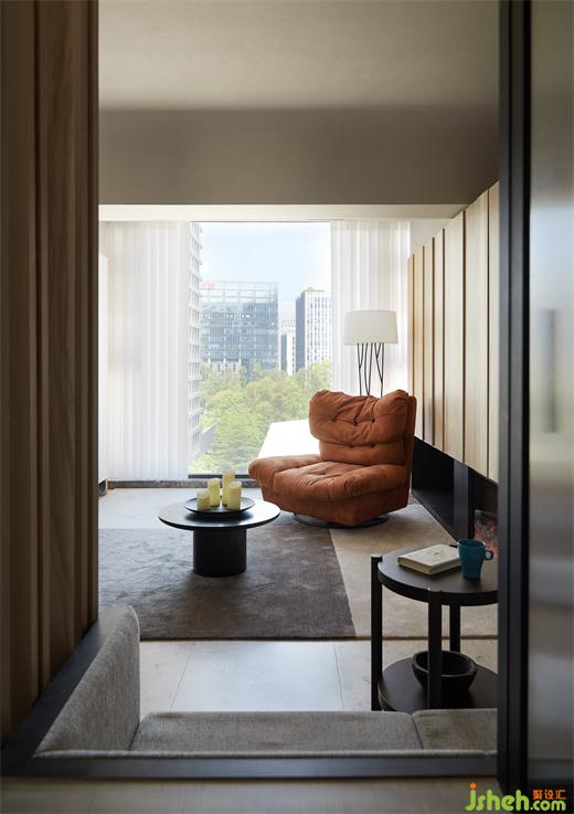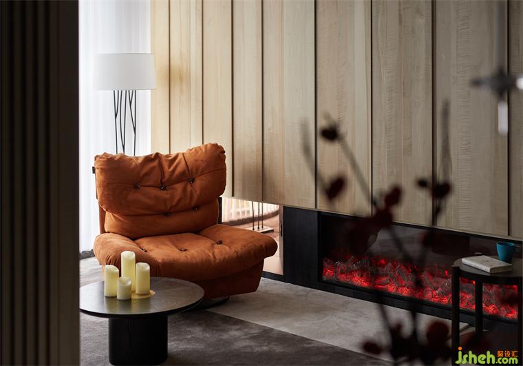客廳面以一個(gè)現(xiàn)場制作木格柵為屏風(fēng)的工藝呈現(xiàn),有著粗獷的感覺。黑色的幾何形制桌體搭配簡約卡座,豪宅設(shè)計(jì)配上黃棕色溫暖色系單人沙發(fā),簡單不失溫馨,頗具意境。