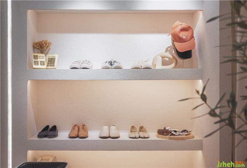 這面墻看似多余,實則為加分項,當(dāng)我們選購服裝時,腦海中總會浮現(xiàn)搭配什么風(fēng)格的鞋子和配飾。在這面墻中,就能很好的解決這個問題,當(dāng)我們美美的出現(xiàn)在試衣鏡面前時,就可以選擇這面展示墻中,風(fēng)格不一的鞋子配飾來搭配,增加顧客購買率。