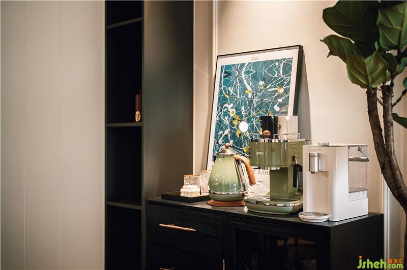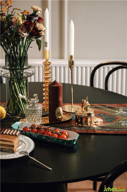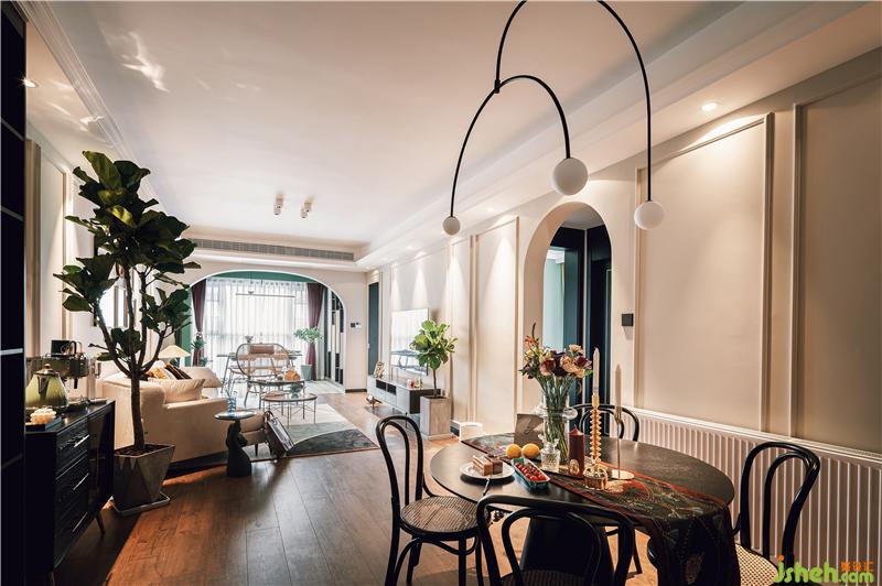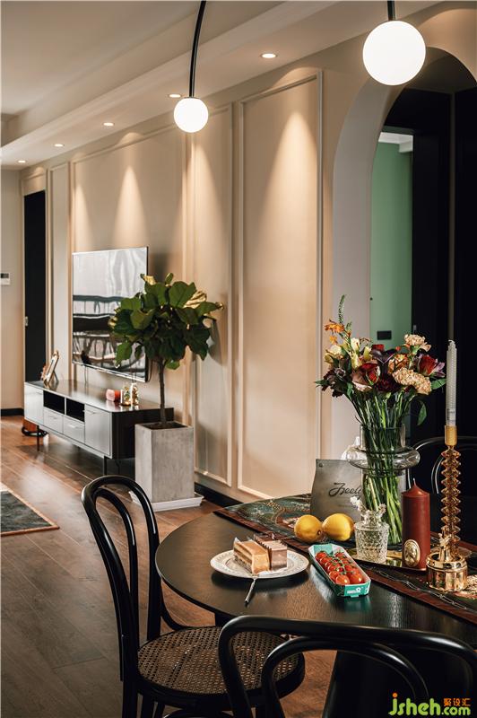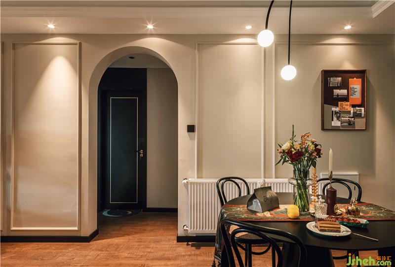 以復(fù)古的石膏盤搭配弧形吊燈,將無(wú)主燈客廳與餐廳相區(qū)分,簡(jiǎn)約的黑色圓桌與藤編椅,與餐桌上的燭臺(tái)、花束、桌旗等搭配相得益彰。餐廳處設(shè)有一電表箱,用以可開(kāi)合的裝飾畫所覆蓋,畫上貼有夫妻倆行走過(guò)足跡照片,整個(gè)餐廳的氛圍都變得溫暖且有格調(diào)。裝修設(shè)計(jì)