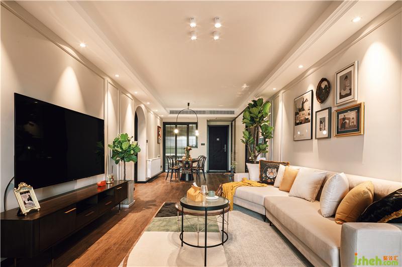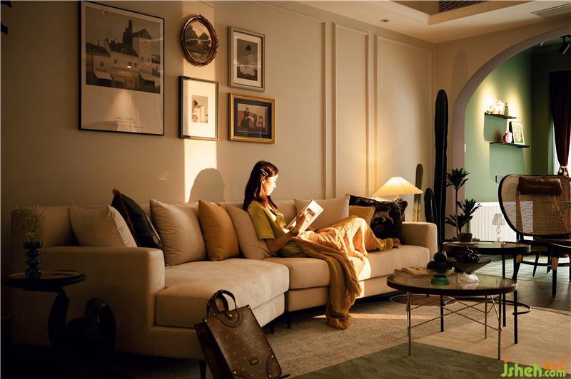無(wú)主燈設(shè)計(jì),使客廳空間更開(kāi)闊,墻面以白色為主,添加了石膏線,增添了房屋的立體感。所有地面均采用木地板,比地磚會(huì)更有溫度,客廳異形沙發(fā)與室內(nèi)植物相連接,讓整個(gè)空間更具有生機(jī),也有屏風(fēng)隔斷的作用。陽(yáng)光穿過(guò)落地窗灑入屋內(nèi),與一盞懷舊復(fù)古的落地小臺(tái)燈微弱的光,交相輝映。這斑駁的光影,靈動(dòng)且恬靜,讓家具與藝術(shù)品的結(jié)合更加出彩。