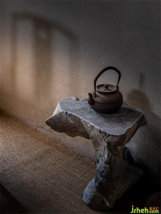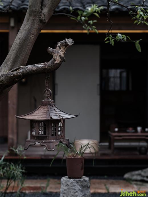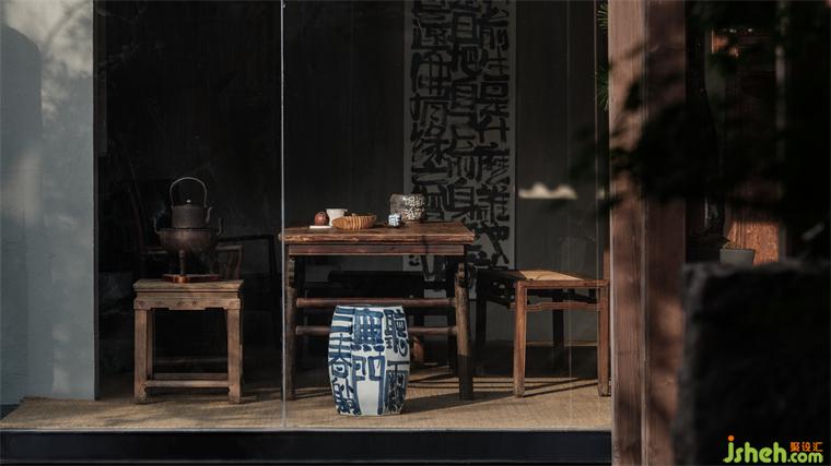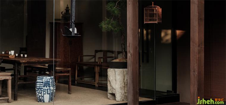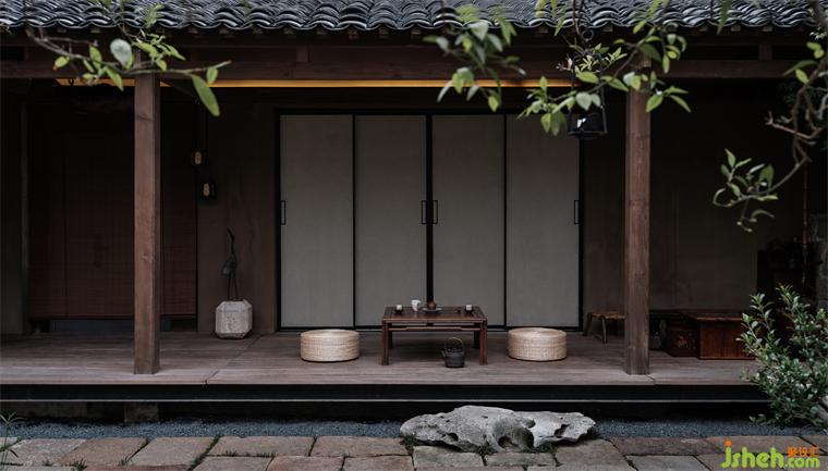 兩面是房屋,一面落地玻璃。正對院門,視覺上延伸出幽遠(yuǎn)之意。