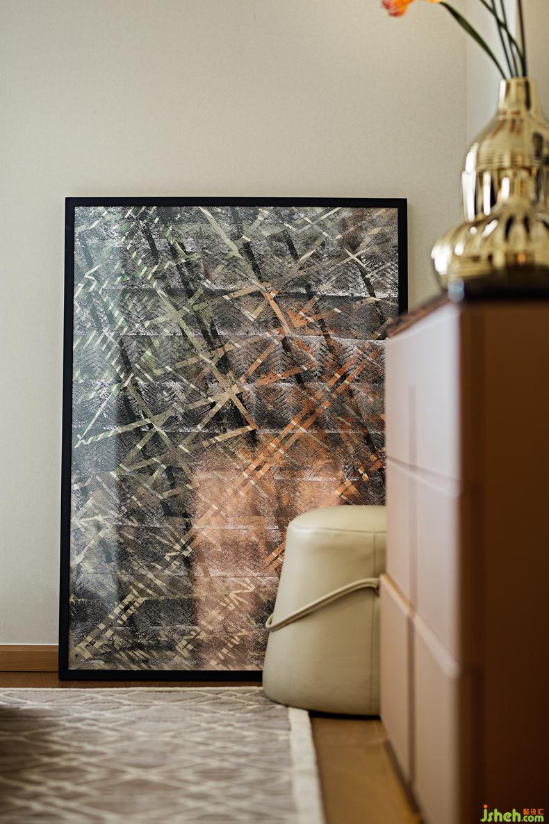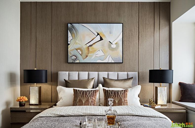 次臥沉穩(wěn)溫潤的米色軟包床搭配抽象掛畫藝術(shù)感十足,舒適高端的定制床品布藝讓居者身臨其境的感受奢華魅力
