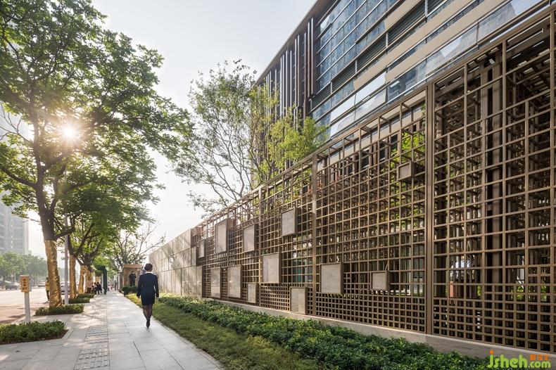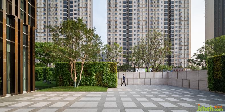 入口廣場由禮序前廳和特色廣場兩個空間構成,后退的景墻設計弱化城市與宗地的界分感,同時空間更顯開闊大氣而又不至于一覽無余,簡單中的微妙轉折,更新著人們的視覺感受。