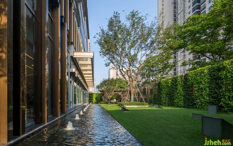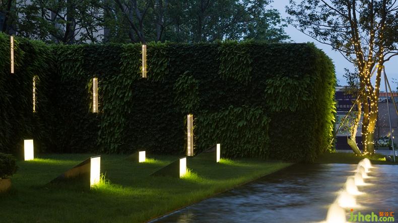 連綿的地景,搭配輪廓分明的音樂草地燈,設(shè)計公司通過這些簡單而微妙的關(guān)聯(lián),與整體設(shè)計元素相呼應。綠植墻的設(shè)計讓綠在立面上得以延續(xù),塑造出了空間的多維層次感。