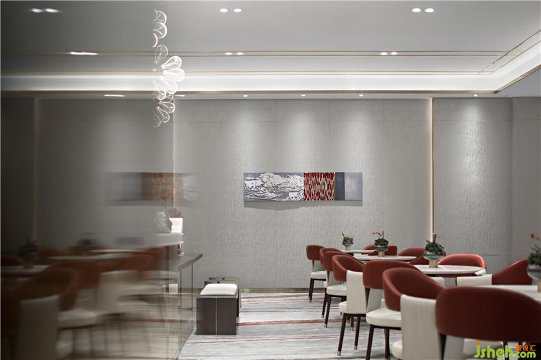 一處建筑的表現(xiàn)張力往往從公共空間開始,黑灰色調(diào)襯托著鎏金色度的優(yōu)雅,方正開闊的空間秩序鋪陳著儒雅的敘事邏輯,移步亦趨的旱景作品鋪設(shè)出古韻的藏墨畫卷,讓空間遐帶一隅夢回之境,對話中式美學(xué)的謐靜。