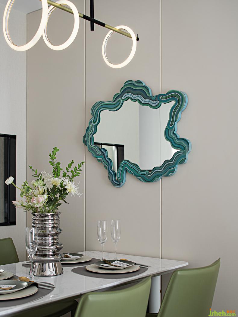對(duì)潮流的熱愛總可以在餐廳區(qū)域有著超越時(shí)空的呈現(xiàn),創(chuàng)意十足的環(huán)裝疊加式頂燈,樣板房設(shè)計(jì)不規(guī)則的空間浮雕餐邊鏡,搭配著讓視野足夠舒適的星云綠花藝布景的桌幾,簡卓設(shè)計(jì)的餐椅讓餐廳跳脫出傳統(tǒng)的認(rèn)知,每一處細(xì)節(jié)都是作品。