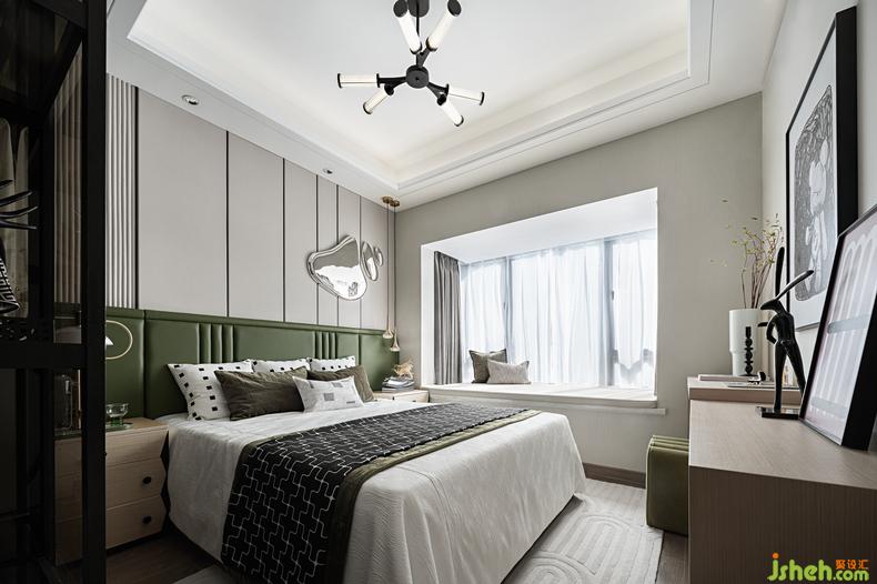 進(jìn)入主臥印入眼簾的即是它通透的格局和質(zhì)感的肌理,星云綠的色彩聚焦搭配著素色拼貼的幾何線條,陽光透過飄窗落入室內(nèi)即有最舒適的關(guān)系色彩,打破時(shí)空的局限,輔以創(chuàng)意感十足的燈具置景和居者熱愛的星際熊潮流作品,生活即是樂趣。