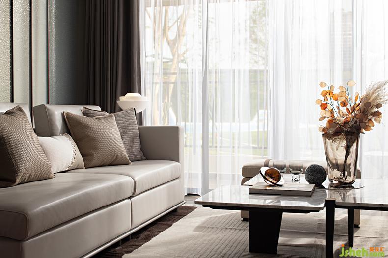 進(jìn)入客廳,首先會(huì)被它柔和的色彩所吸引,不論是皮質(zhì)的沙發(fā)還是地毯的布景,即使是桌幾上的靜物擺件,樣板房設(shè)計(jì)都是足以讓人沉靜心情的色度,在落地的光影中感受久坐而不會(huì)厭倦的閑憩,一本書,一杯咖啡,都是值得細(xì)細(xì)品味的樂(lè)趣。