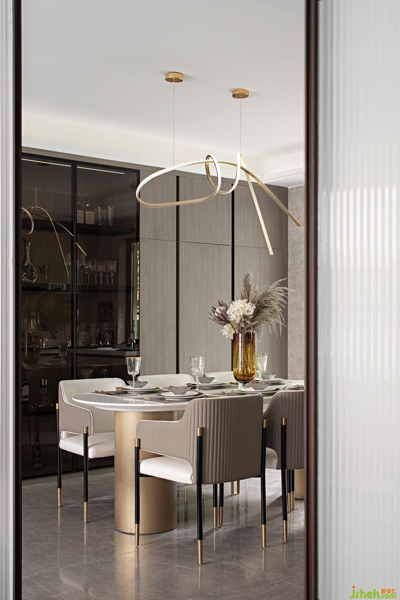 視野轉(zhuǎn)角到餐廳區(qū)域,雙動(dòng)線的設(shè)計(jì)在這一隅開(kāi)闊的空間中顯得游刃有余,創(chuàng)意頂燈、金屬色調(diào)、幾何圖形,樣板房設(shè)計(jì)藝術(shù)裝置在這個(gè)屬于美味的世界里更多些奢華的氣息,在南北通透的光影之下,品味一場(chǎng)極具儀式感的私享宴遇。