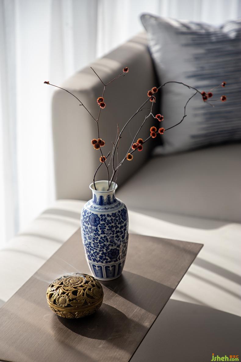 客廳細(xì)節(jié)丨溫潤的墨色、清透的紗簾、飽滿的陽光,樣板房設(shè)計(jì)空間氣質(zhì)在強(qiáng)烈與雅致間自由切換,新與舊在這里自然融合而不相斥,呈現(xiàn)出空間與物體共處的和諧美感。