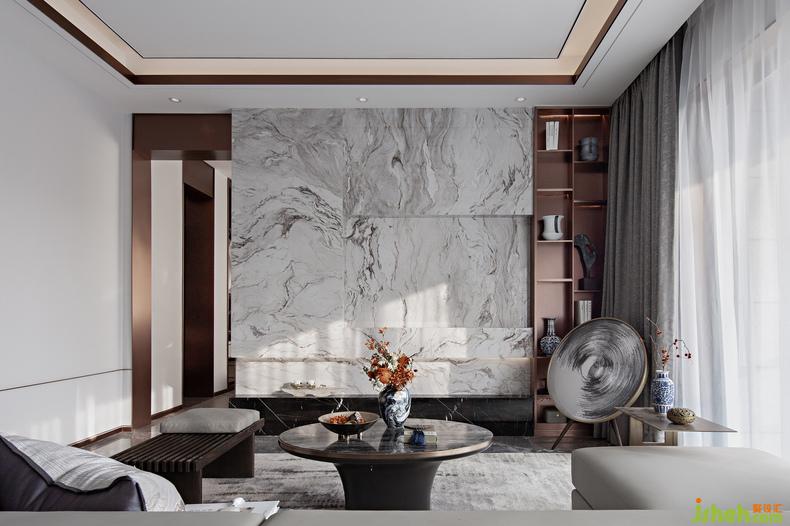 從餐廳看向客廳丨長型空間加強(qiáng)了深邃的縱深感,大理石面如同遠(yuǎn)山畫作,樣板房設(shè)計(jì)尤顯靈動雅致,利用水墨元素定制的藝術(shù)音響,給予現(xiàn)代標(biāo)簽化之外的東方氣質(zhì)。