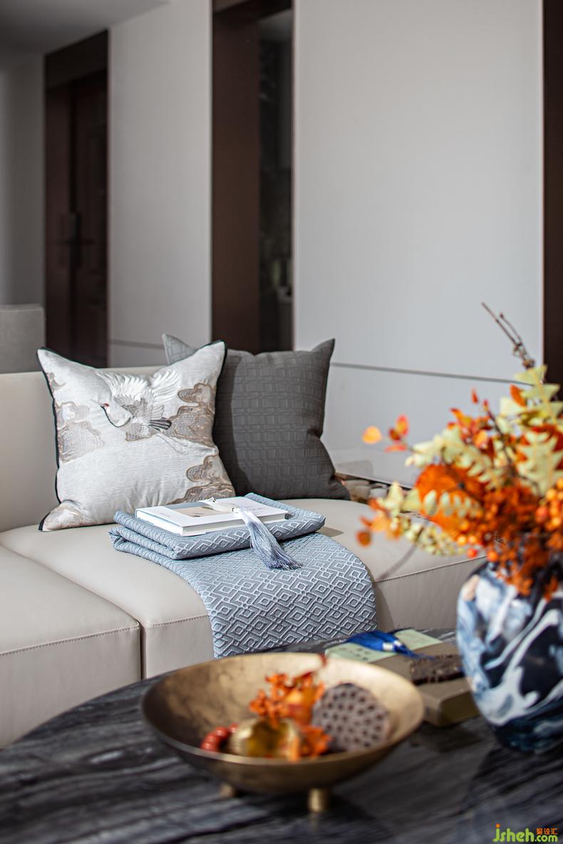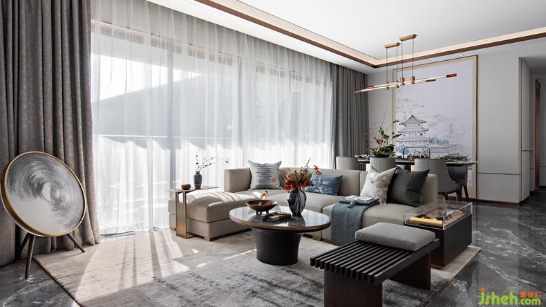 客廳丨將傳統(tǒng)文化意境中的遠(yuǎn)山淡影、恬淡安舒、虛懷澄明,樣板房設(shè)計(jì)以藝術(shù)設(shè)計(jì)的方式實(shí)現(xiàn)出來,人文精神浸潤空間內(nèi)外,追躡時(shí)光的足跡更顯意味悠長。