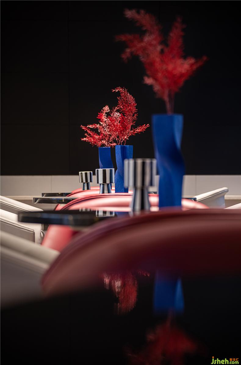 洽談區(qū)細(xì)節(jié)丨克萊因藍(lán)和波爾多酒紅的互補點綴,相互映襯、裝修設(shè)計突顯并烘托藝術(shù)的極端“外向”性,同時又不乏時尚的敏銳和跳脫。