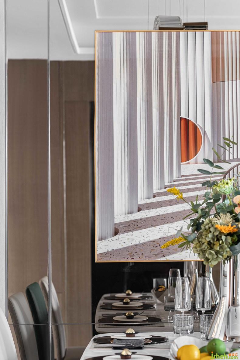 餐廳丨延續(xù)客廳個(gè)性的調(diào)調(diào)與氛圍,金屬玻璃器皿與藝術(shù)掛畫增添品質(zhì)生活的格調(diào),讓整個(gè)空間的狀態(tài)提升到另一個(gè)美好層面。