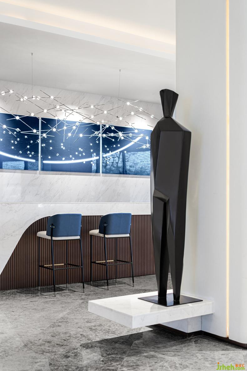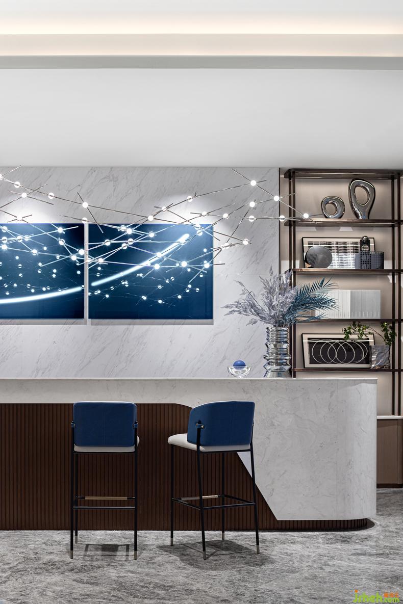水吧區(qū)丨 重組和煥新式空間敘事梳理流線的關(guān)鍵,室內(nèi)設(shè)計師水吧空間的剛?cè)嵬瑯?gòu)讓視野更加聚合,明快的浩瀚藍(lán)勾描著未來的體驗感,豐富交織的縱貫頂燈,彼此疊置融合,串聯(lián)交互,更衍生出序列的體驗感,讓寰宇滲透進(jìn)可塑的空間體量中。