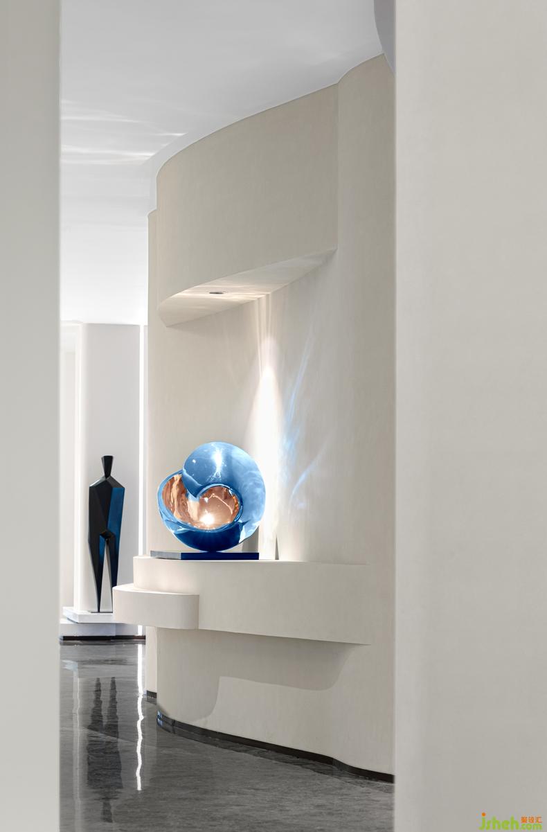 走廊丨 動線的流通總是可以成為契機(jī),來激發(fā)更多能量的釋放,室內(nèi)設(shè)計師一處流線波紋的創(chuàng)意靈感,透過視野的角度呈現(xiàn)自由的變幻,自身的蔚藍(lán)的光影配合光源的反射,讓體驗更加豐富、真實和多元。