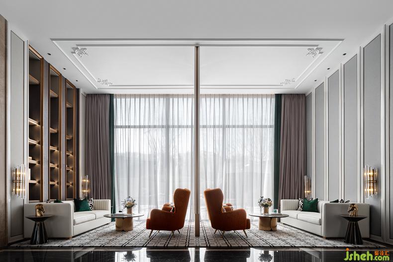 中廳洽談區(qū)丨 不刻意挑戰(zhàn)前衛(wèi)創(chuàng)新,也不流于趨勢隨風(fēng)擺動,室內(nèi)設(shè)計師開闊明敞的理性訴求架構(gòu)規(guī)整,而色彩則為其注入了感性的脈絡(luò),猶如珠寶洽談區(qū)的溝通方式,半圍合的形式給予洽談序列,縱橫對稱的審美語言讓空間敘事精致典雅。