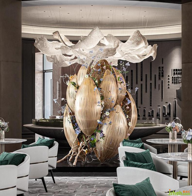 立于中廳深深吸引人們注意力的藝術(shù)裝置,從地面而起,向上蔓延,緊緊包裹的身軀中蔓出千姿百態(tài)的花木枝丫,似乎完成了在與大地交談后,努力釋放著強大的力量。