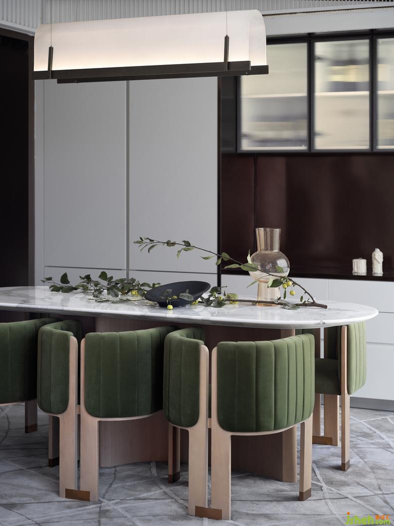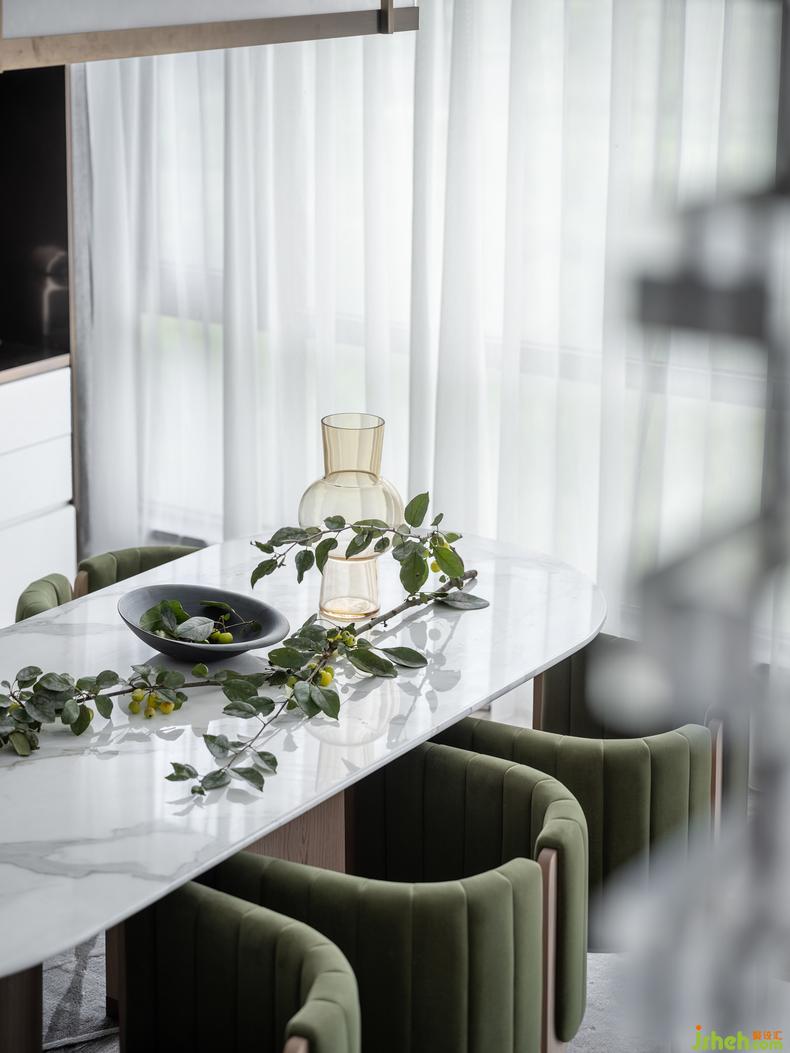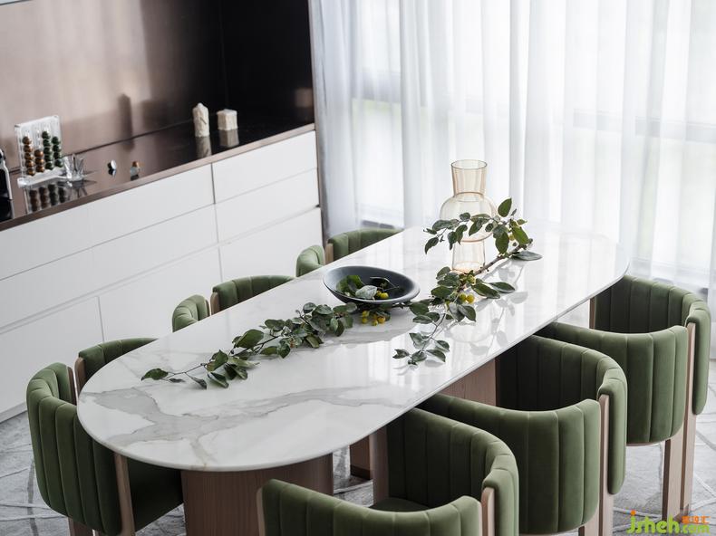 餐廳的布局方正且通透,墨綠與浮白的色彩配比從客廳延續(xù)開來,樣板房設(shè)計營造出視覺沖擊,石材與木質(zhì)的餐景裝飾呼應(yīng)著落地光影映射下的蔥郁綠植,將自然融入空間,讓時光藏著愜意。