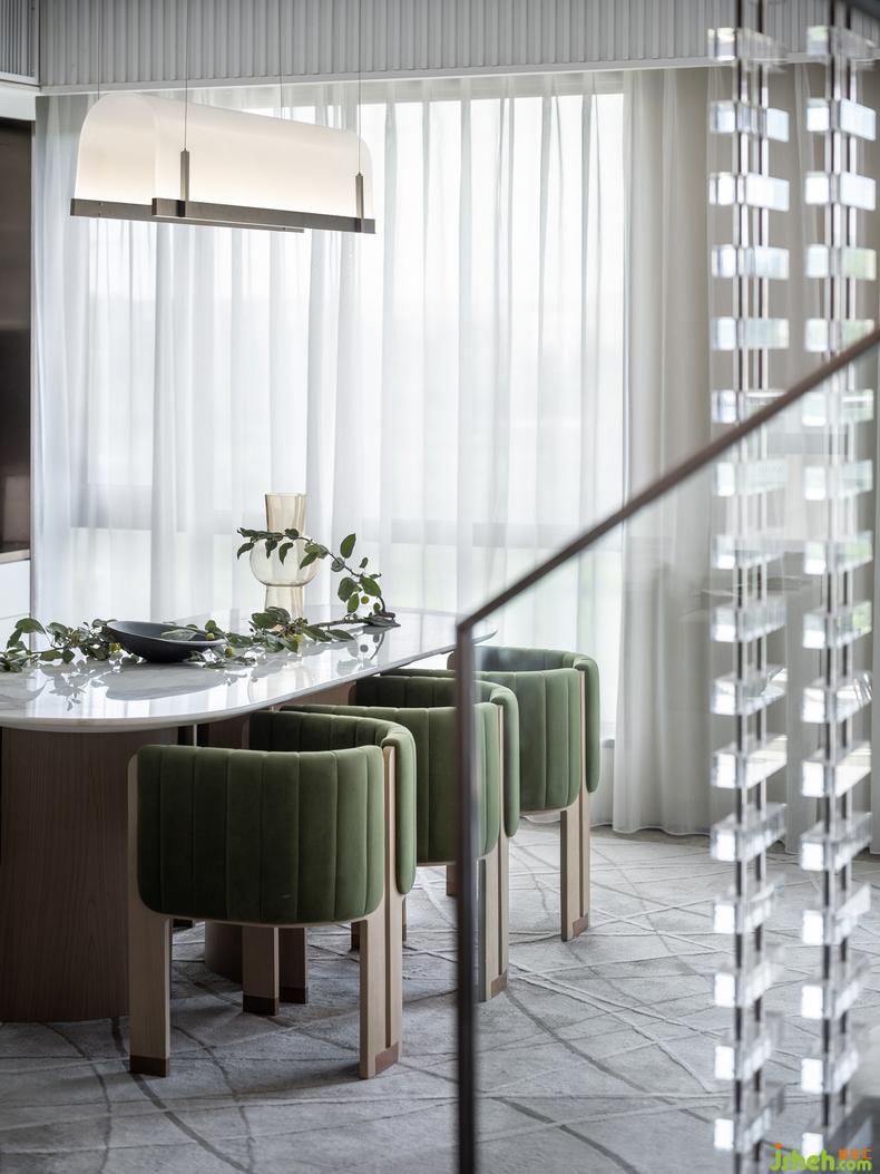 餐椅面料運用正如花草果實的關(guān)系一般,營造春意盎然的藝術(shù)美感,樣板房設(shè)計桌面上綠的白的都像生長出來的果實一樣,我們一口吃下陽光,一口吃下時光。