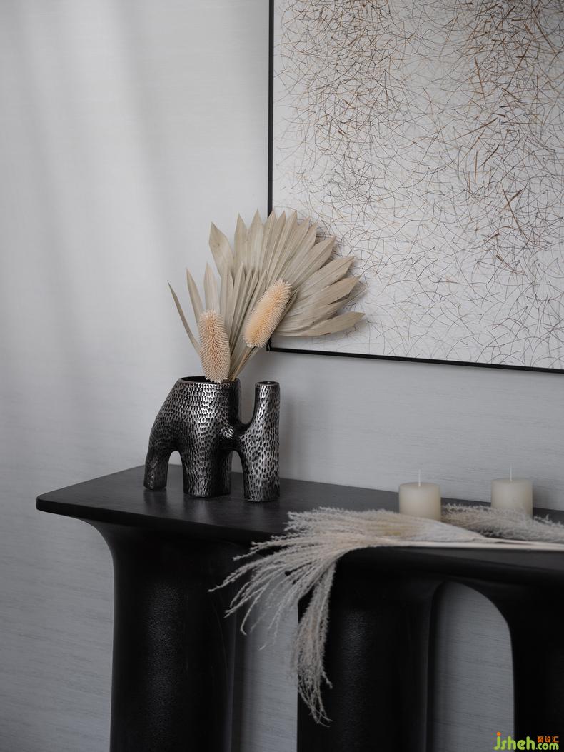 床頭掛畫丨賈娜娜(Janaina Mello Landini)所創(chuàng)作,樣板房設計樹枝藝術裝置讓人聯(lián)想到纏繞在一起的樹枝具有生機與靈動,墻上開綻茂盛的樹枝仿佛有著屬于獨特的淡雅木香,清新明朗枝形藝術邊幾高低不一,象征著樹木日日向上,生生不息。