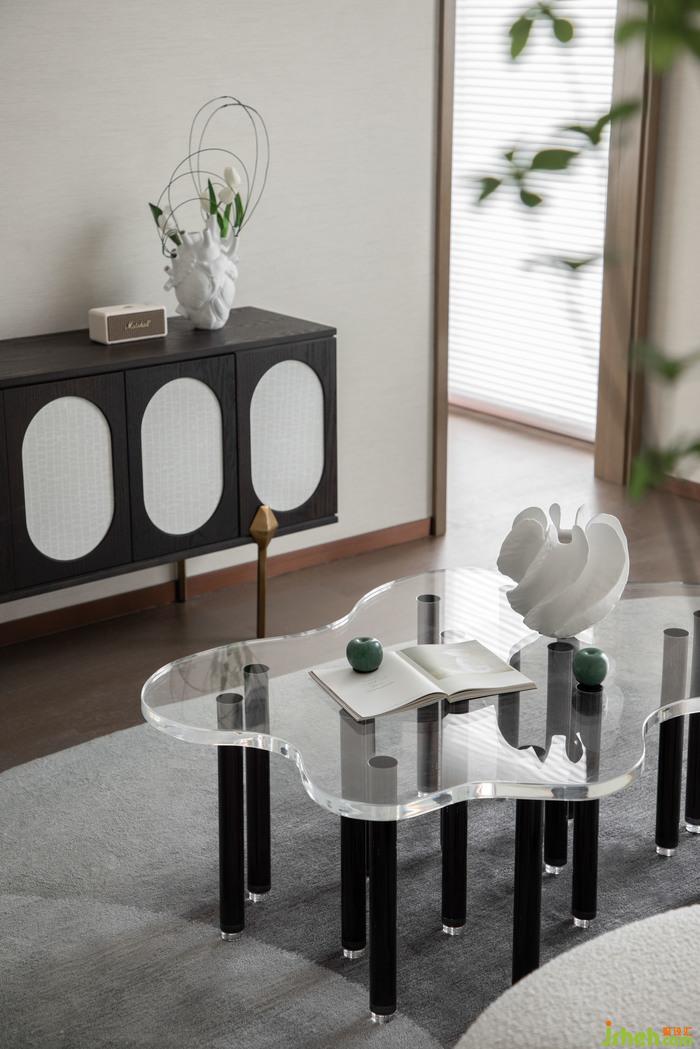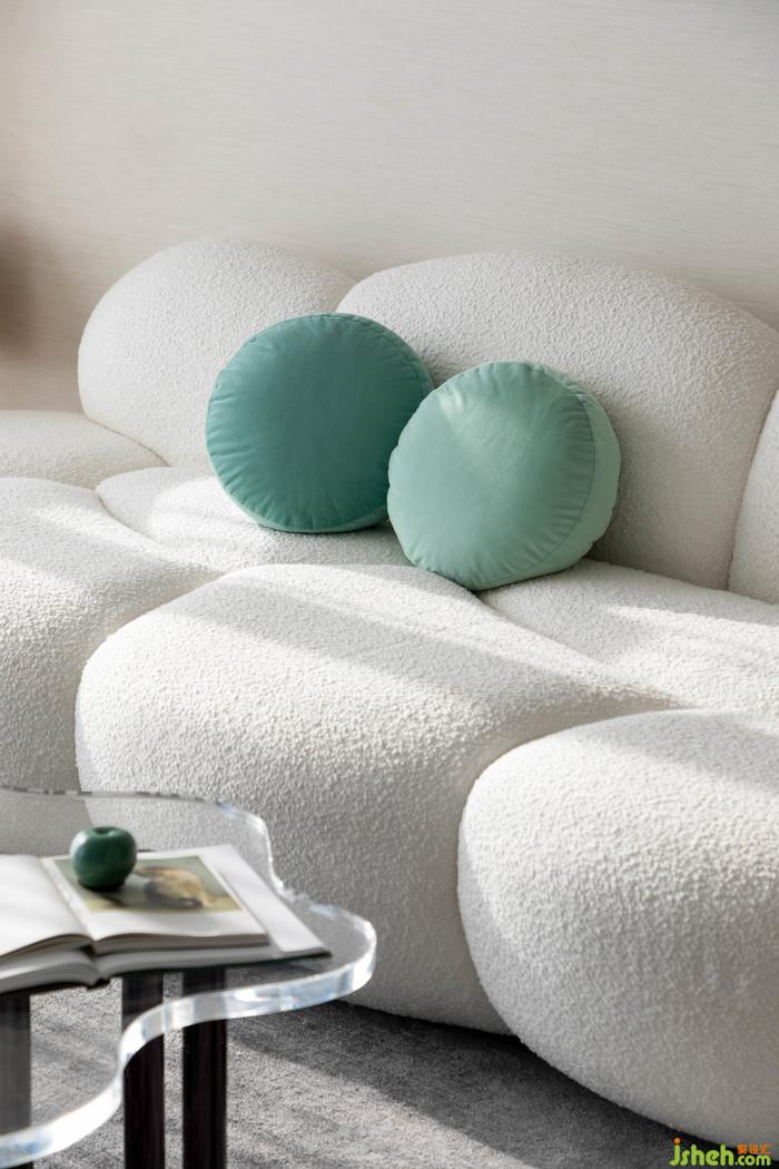 客廳丨異型的毛料沙發(fā),亞克力桌幾的不規(guī)則寫意配比,通過(guò)富有動(dòng)感的線性褶皺增強(qiáng)了半透明效果,給視野無(wú)盡的柔和與創(chuàng)意,讓客廳的互動(dòng)空間充分響應(yīng)了來(lái)自生活的治愈,即使漫游其中,既可以通過(guò)不同的視角,感受空間的暢意