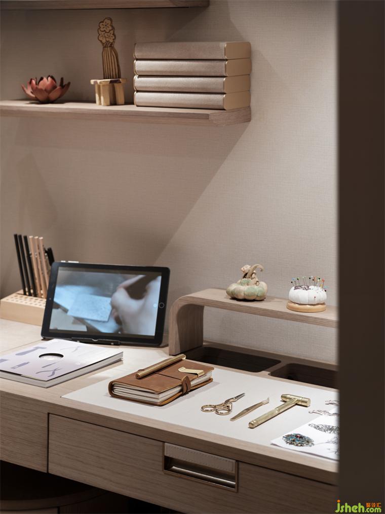 工作室丨樣板房設(shè)計(jì)整面的柜體將和工作的資料與物品被整理得井井有條,操作臺(tái)上的工具都是用慣手的,那些不常用的都收納在一旁的柜子里,抽屜里放著各種組合的材料與樣式,長(zhǎng)長(zhǎng)的操作臺(tái)給她實(shí)現(xiàn)夢(mèng)想的基礎(chǔ),靜謐包容的空間完整她所有的想象。