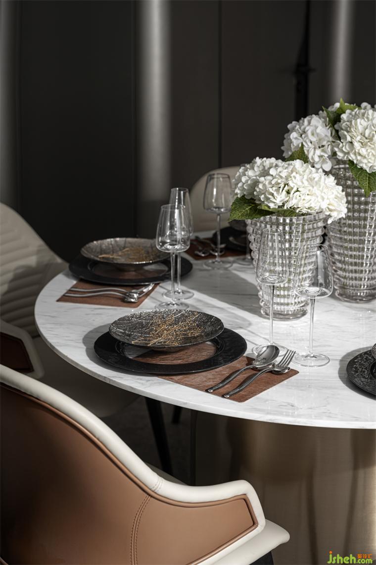 餐廳丨U型半開放式的廚房將餐廚島臺(tái)融合到設(shè)計(jì)里,極大地利用空間,樣板房設(shè)計(jì)圓形餐桌能容納多人圍坐餐食,聚攏人氣,給予濃烈的生活氣息;精致的餐具組合增添空間的質(zhì)感,在品味餐食的同時(shí)也在品味美好生活。