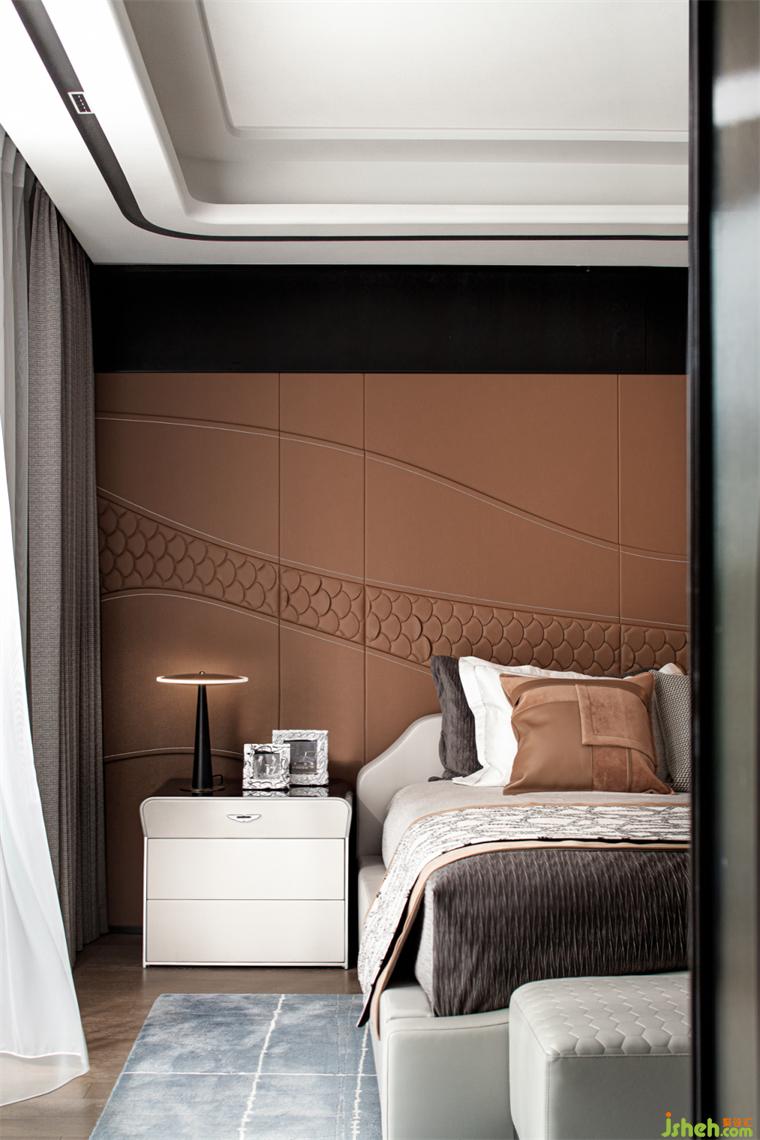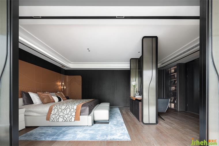 主臥丨深淺的調子溫柔雅致,搭配橙色低調內斂的魅力,樣板房設計融入空間的角落,在不經意間,碰撞年輕的活力,精致的皮革、柔軟的棉麻與經典的家具線條鋪陳輕奢。與眾不同,是始終不落入俗套。