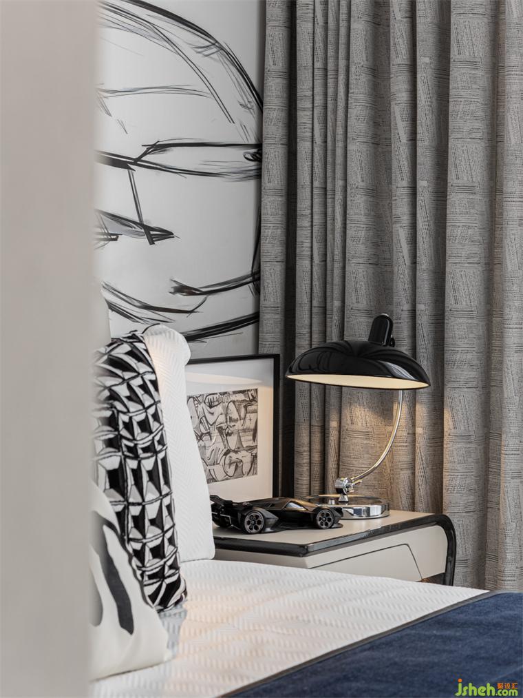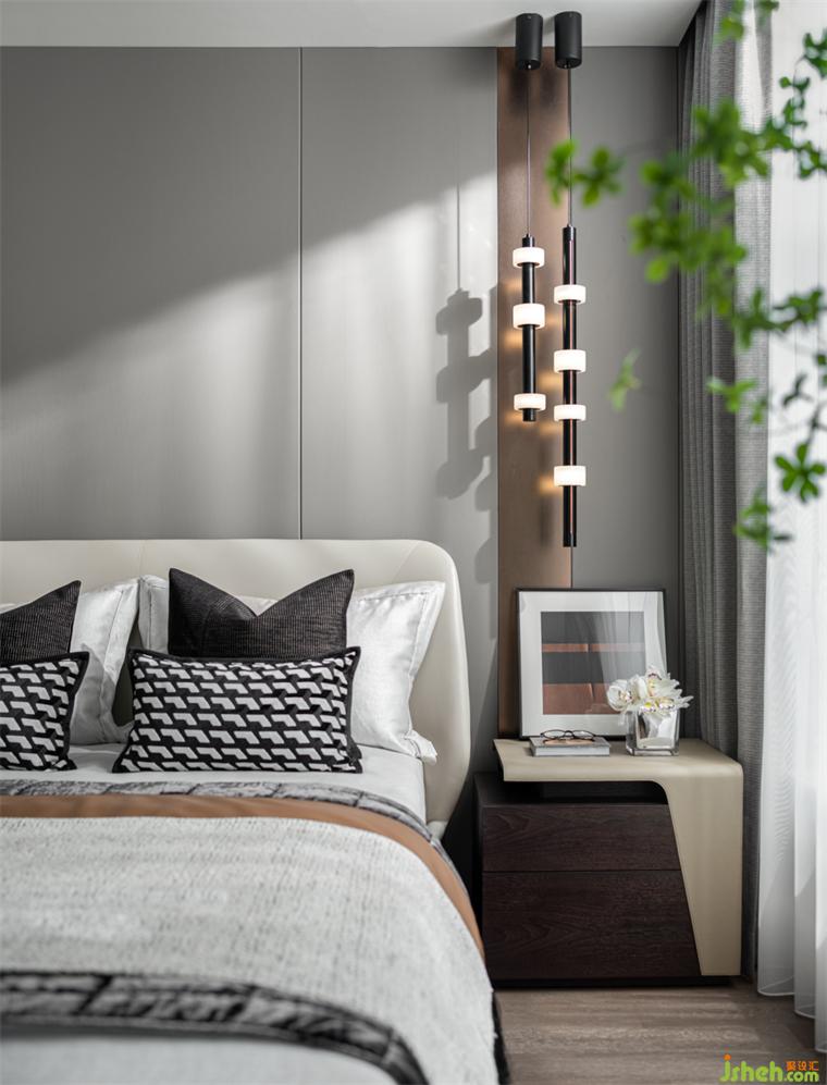 客臥丨延續(xù)低調大氣的調性,以暖白調的皮革鋪陳輕奢質感,輔以菱格紋、時尚燈具、植物與藝術品的組合來彰顯生活品味與態(tài)度,讓居住者在柔軟中放松,在雅致里愜意。