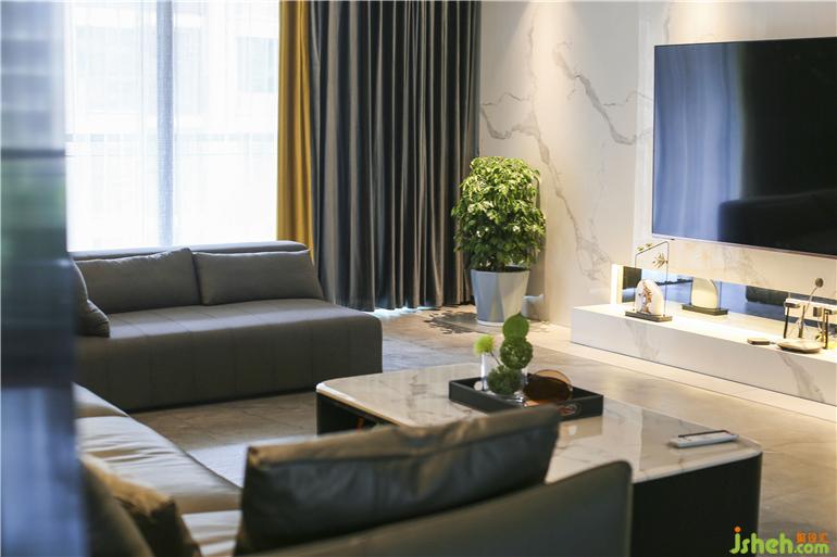 客廳在布置上比較簡潔,電視背景墻以白、咖兩色為墻面主要顏色,地面用質(zhì)感極強(qiáng)的深色瓷磚,展現(xiàn)港式的前衛(wèi)時尚。