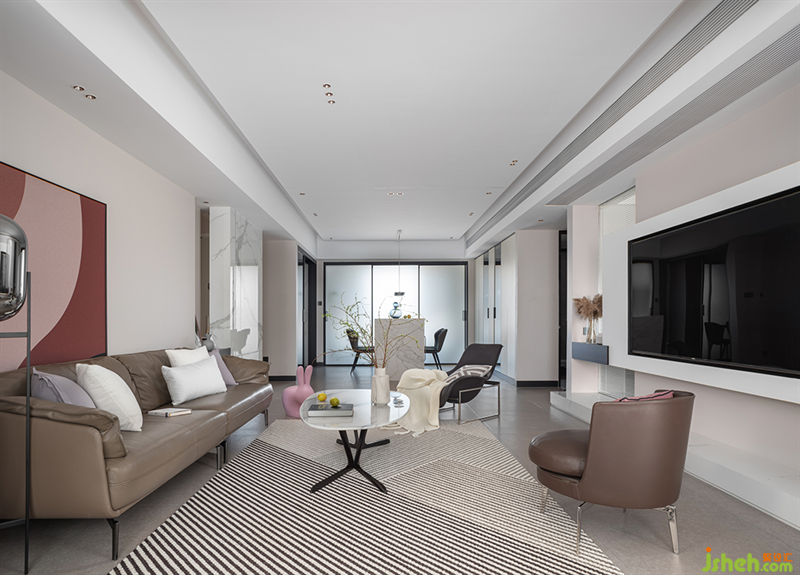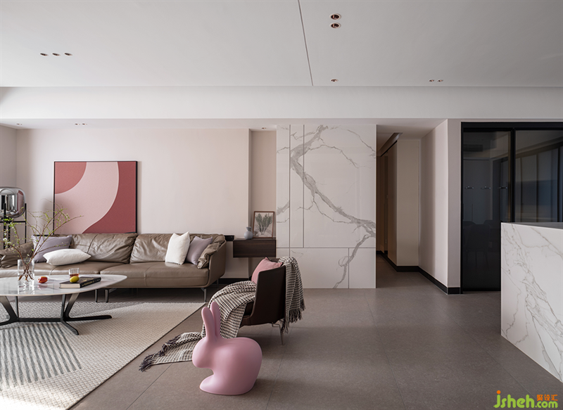 一幅粉色系壁畫猶如點睛之筆,更添一抹藝術(shù)氣息。極簡線型燈,高級且有質(zhì)。