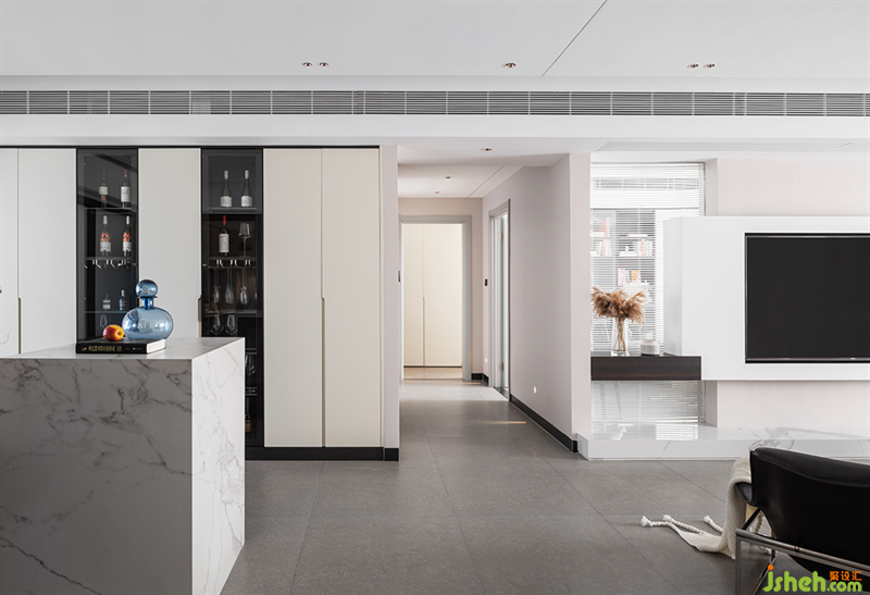 酒柜鑲嵌于整塊墻壁之中,在無風(fēng)無雨的日子里,約上三兩好友,共同品鑒紅酒,搖曳的燈光與甘醇的酒香是高品質(zhì)生活的顯露。