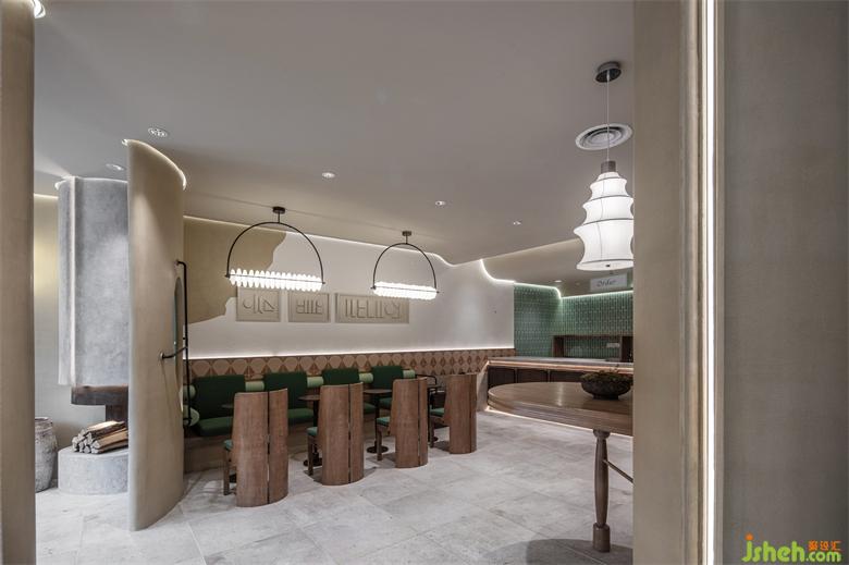 荒漠綠洲最難覓,轉角茉香更沁人。入口處沒有撲面而來的蔥蔥郁郁,反而將微水泥的原始質(zhì)感延伸到室內(nèi),餐廳設計粗糲的墻面既像是工業(yè)文明遺跡,又像古老的羊皮卷,將室內(nèi)外的設計鋪陳協(xié)調(diào)一體,打造端景的同時,又與原木裝飾呼應,營造出斑駁的荒蕪感。