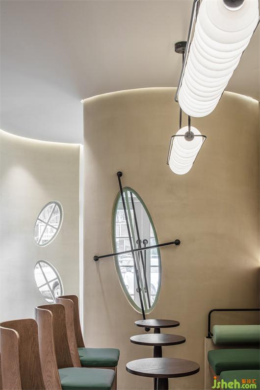 The curved surface of the half arc transits from the entrance to the fixed seat area, forming a deep extension sense, dispelling the limitations of space and outlining a more spacious and harmonious state. In the transparent and open scale, the round and delicate lines of tables and chairs form a new block, increasing the privacy of each independent small space. The walnut color with clear texture is dotted with fresh and natural jasmine green, just like luxuriant woody plants. As the transition between desert and oasis, it has the beauty of wild and unrestrained growth.