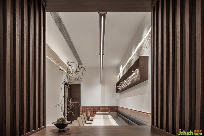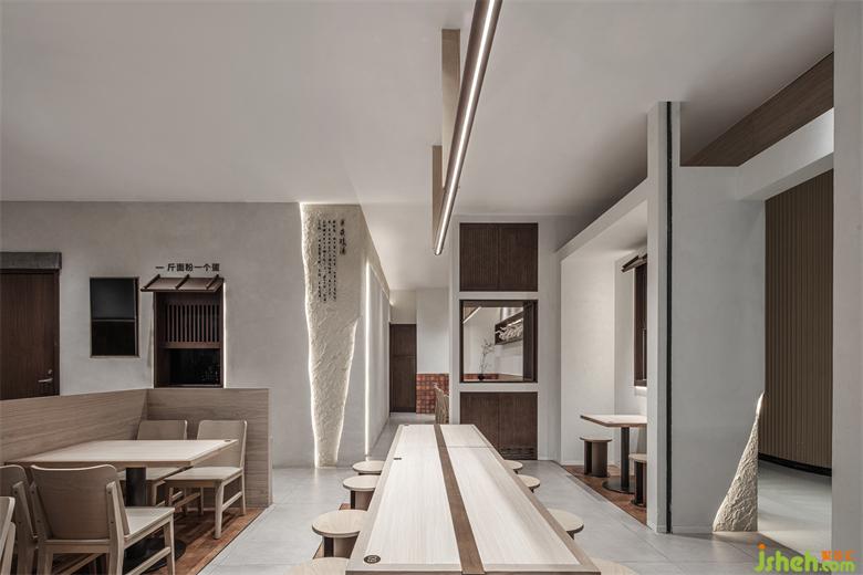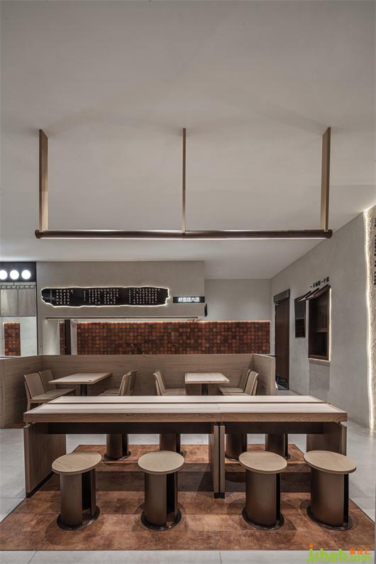 The door header is simplified, and the Suzhou style architectural elements are introduced in modern ways. Wood and brick, geometric shape and arc are interspersed and superimposed to blur the spatial boundary and create an immersive sensory experience with virtual and real crisscross. The mottled walls are supplemented by the decorative effect of lights to add a touch of delicacy beyond time and space into the rough appearance, giving people a warm style full of liife, making the whole restaurant independent of the complex and diverse environment of the mall and forming a unique visual focus.