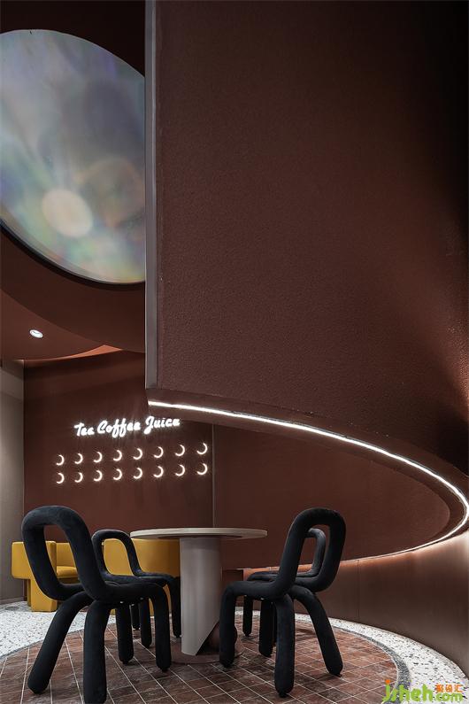 門頭造型呼應(yīng)飛船著陸的概念,奶茶店設(shè)計運用自然與物象的肌理,組合成新的趣味性視覺語言。外墻面刷成焦糖色,宛如高原上的“紅土壤”,有著來自原始的包容性。大小不一的球形燈散落在粗糲且質(zhì)樸的隕石壁上,營造出強(qiáng)烈的視覺沖擊感,引導(dǎo)來往的行人去探尋、發(fā)現(xiàn)和感知。