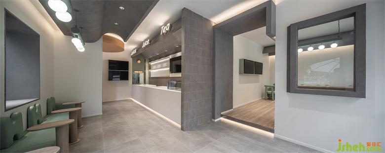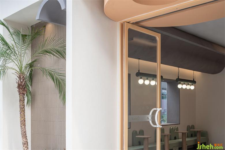 推門而入,室內(nèi)沿襲了外觀的簡(jiǎn)約與內(nèi)斂,以奶茶色和高級(jí)灰為主調(diào),輔以原木、淺綠,奶茶店設(shè)計(jì)為空間注入清新、自然的意蘊(yùn),奠定一種溫馨、治愈的社交氛圍。設(shè)計(jì)師運(yùn)用現(xiàn)代建筑思維方式,從曲線與直線的組合中,擷取并延伸出有規(guī)律的形體來構(gòu)筑空間關(guān)系,打造通透開闊、層次分明的餐飲環(huán)境。
